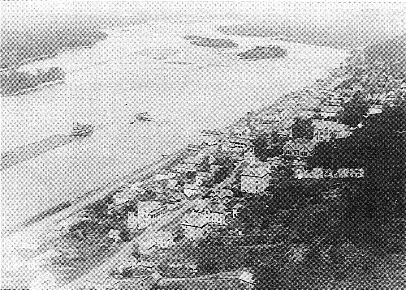 Looking north at Alma and the Mississippi River from a point on the hillside, probably around current day Buena Vista Park. Taken before the dam was built, the upper Harry Islands appear clearly at the top center part of the photo.