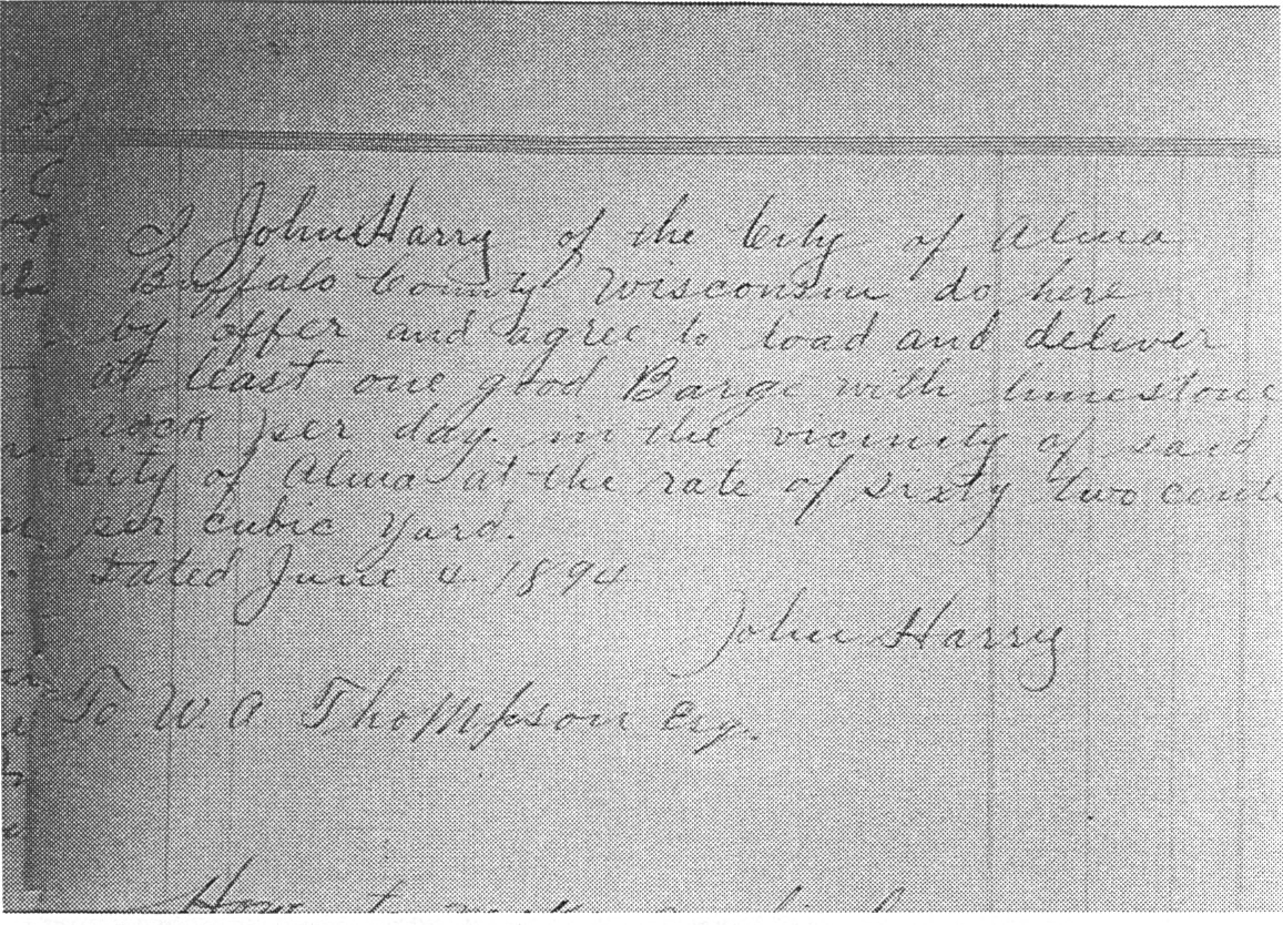 Copy of the contract John Harry had with W.A. Thompson, Esq. “to load and deliver at least one good Barge with limestone rock per day” at a rate of “sixty two cents per cubic yard.” The date of the contract was June 4, 1894.